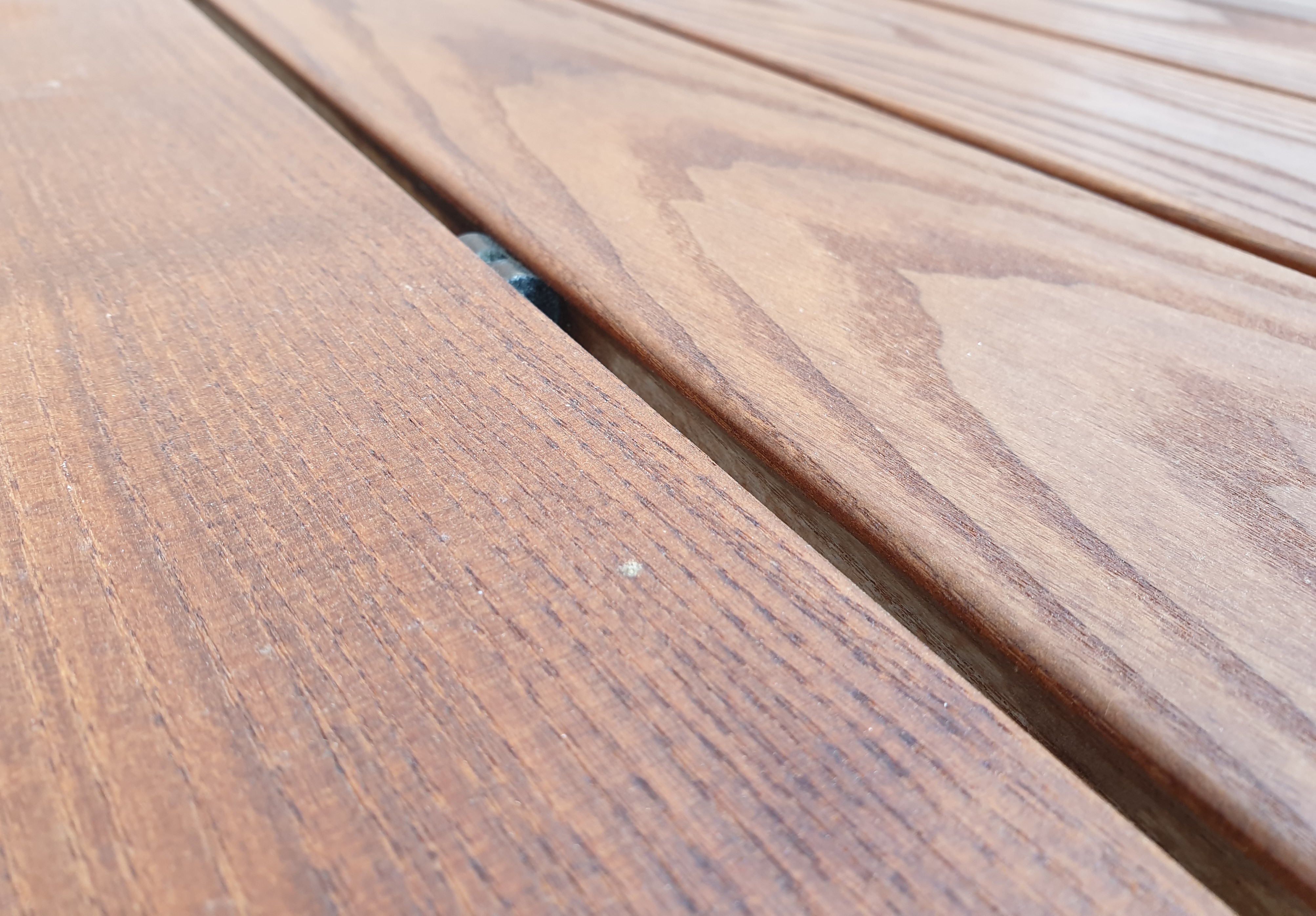 Die Thermoesche durchläuft eine sorgfältige thermische Behandlung, bei der sich die Zellstruktur des Holzes verändert. Das Ergebnis: deutlich erhöhte Dauerhaftigkeit, ganz ohne chemisch Zusätze. Das Holz ist formstabil, verzugsarm, feuchtigkeitsresistent und splittert kaum. Gleichzeitig sorgt die Seno-Fräsung für eine dezente, moderne Optik und erleichtert die Wasserableitung auf der Oberfläche praktisch und schön zugleich.
